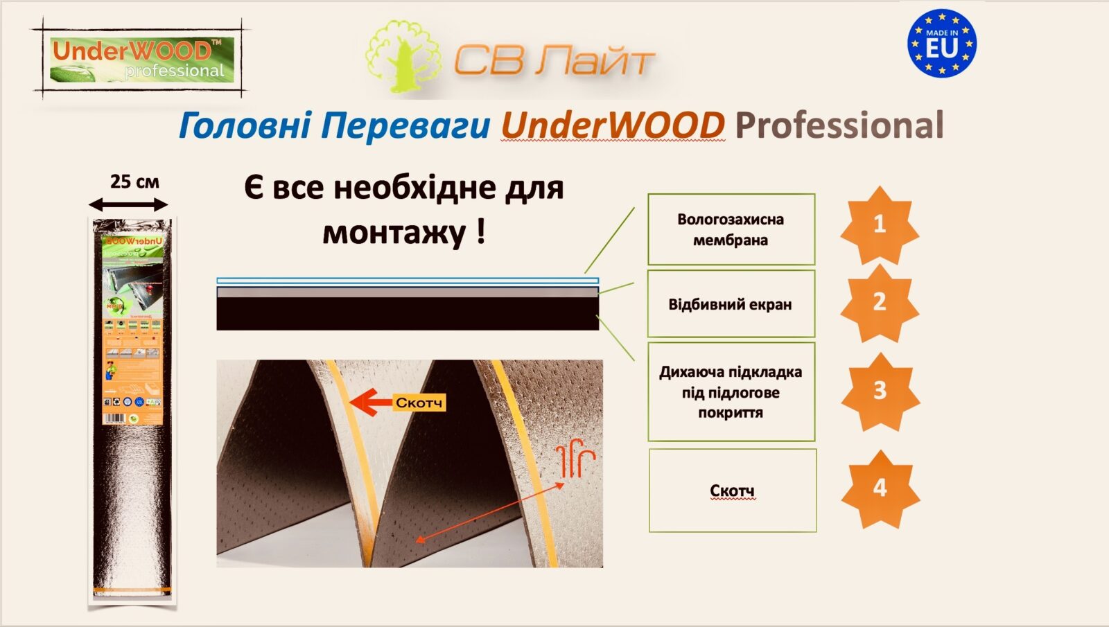 це професійна, універсальна підкладка під ламінат і паркетну дошку, вироблена в ЄС. Завдяки високій якості європейського виробництва, UnderWOOD Professional здатна вирівнювати нерівність чорнової стяжки до 4,7 мм, що дає змогу зберегти замки підлогового покриття.