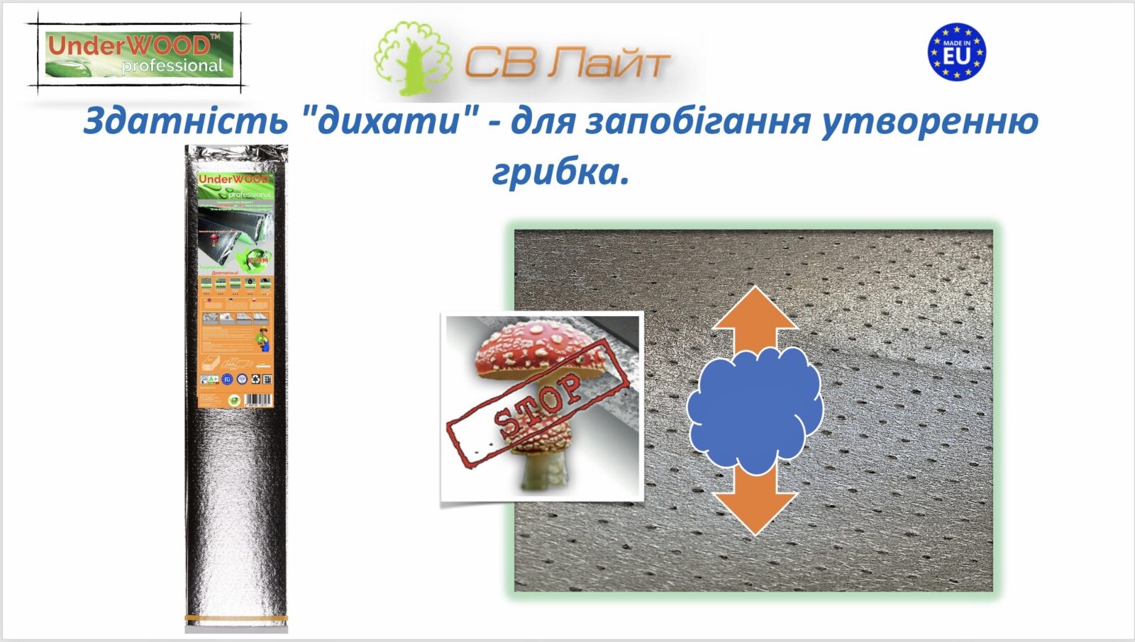 Алюмінієва мембрана виконує функцію гідроізоляції та відбивного екрану, що дозволяє зберігати температуру в приміщенні до 30%. Це означає, що взимку підлога буде утримувати тепло, а влітку – прохолоду, що значно підвищує комфорт проживання. Завдяки цій властивості, UnderWOOD Professional 5 мм з алюмінієвою мембраною/екраном є універсальним продуктом, який можна використовувати не лише для підлоги, але й для стелі та стін (як екран, що зберігає температуру приміщення).